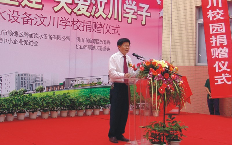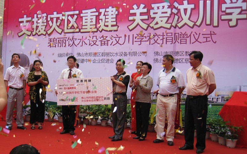 2009年4月,在汶川地震一周年之際,為了盡快幫助汶川受震災區(qū)重建家園,讓汶川的孩子們早日回到自己心愛的校園,讓孩子們喝上健康衛(wèi)生的水,碧麗公司向汶川縣正在重建中的6所學校贈送節(jié)能王數(shù)碼高背板飲水機,為災區(qū)的重建出一份力量,“大愛無疆,情系汶川”,碧麗關愛汶川災區(qū)的孩子,為災區(qū)孩子送上健康水是碧麗人的心愿。