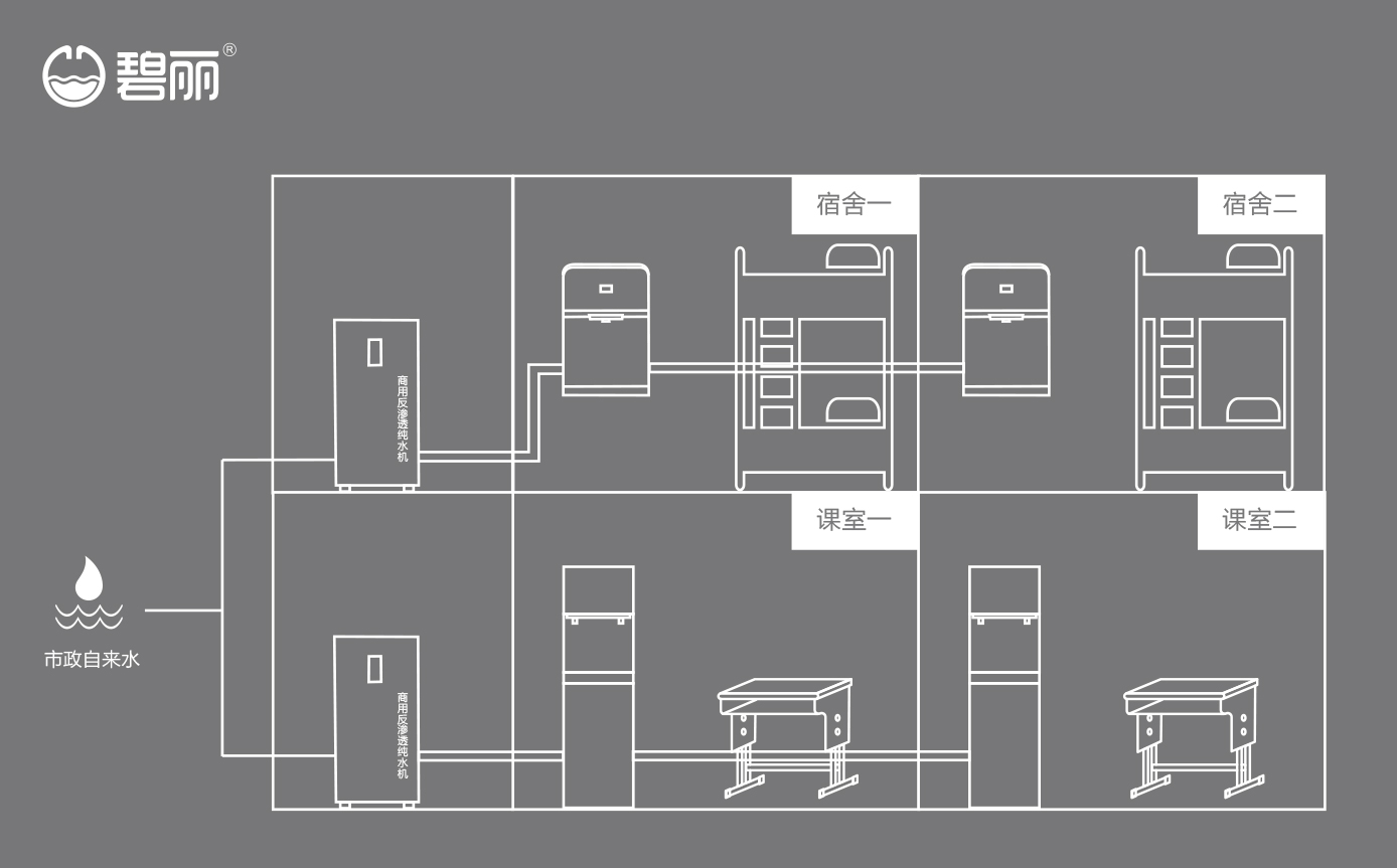 • 碧麗商用反滲透純水機(jī)將自來水集中處理后,把優(yōu)質(zhì)的純凈水通過專用的供水管道輸送到各飲水點(diǎn);