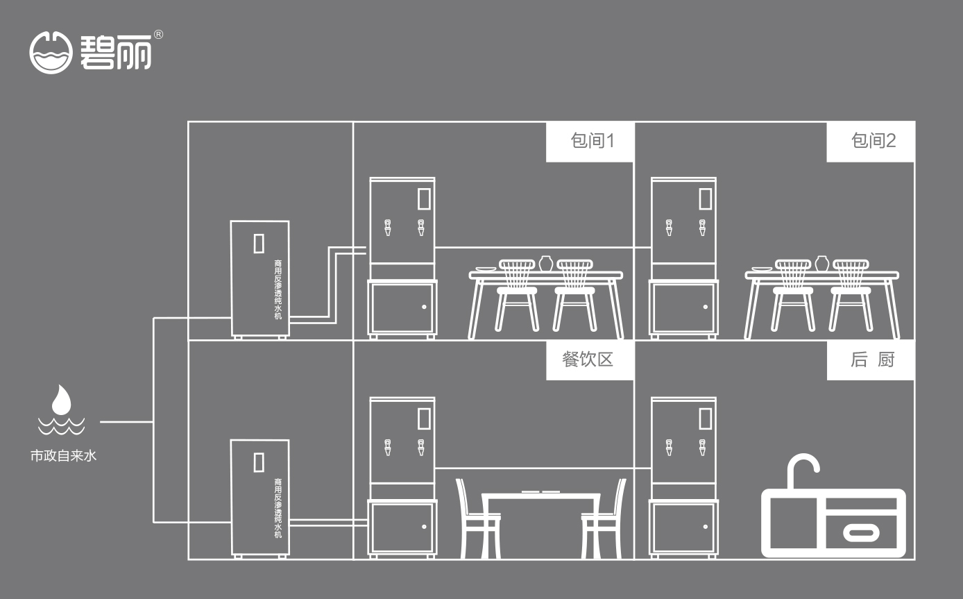 碧麗商用反滲透純水機(jī)將自來水集中處理后,把優(yōu)質(zhì)的純凈水通過專用的供水管道輸送到各飲水點(diǎn);